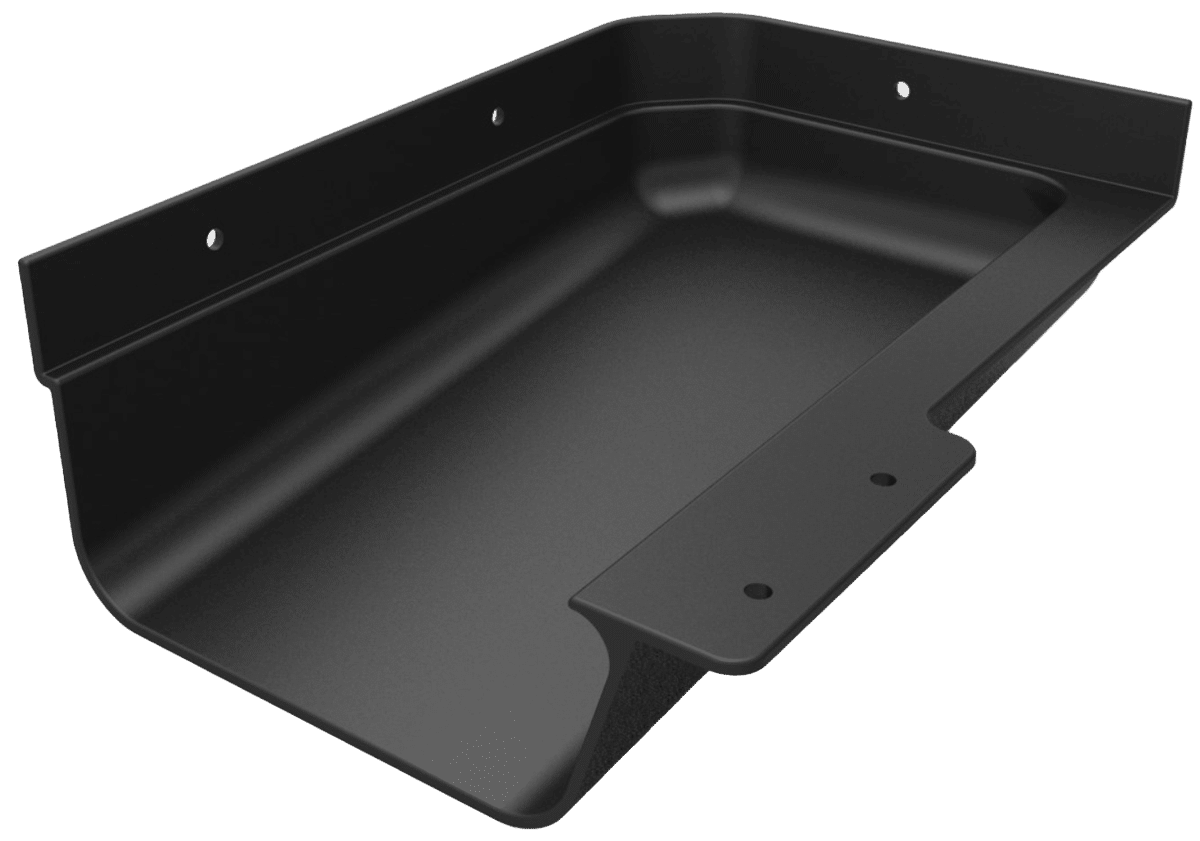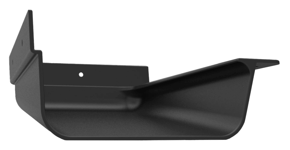 Valley Kicker™ is designed to sit inside and attach to the front lip of a 5” gutter with the ramped mouth of the product pointing toward the Left downspout. It can be installed in the inside corner of the gutter system or in the straight run directly under the roof’s valley.